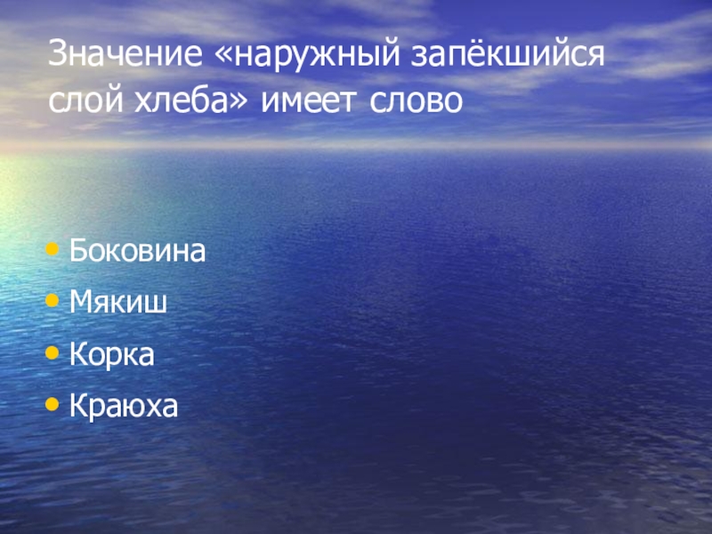 Слайд 5Значение «наружный запёкшийся слой хлеба» имеет слово