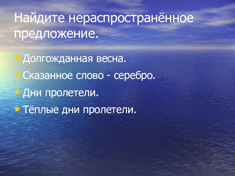 Найдите нераспространённое предложение.Долгожданная весна.Сказанное слово - серебро.Дни пролетели.Тёплые дни пролетели.