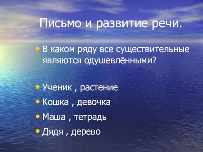 Письмо и развитие речи.В каком ряду все существительные являются одушевлёнными?Ученик , растениеКошка , девочкаМаша , тетрадьДядя , дерево