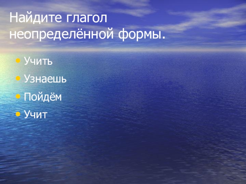 Найдите глагол неопределённой формы.УчитьУзнаешьПойдёмУчит