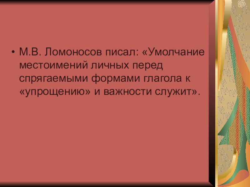 М.В. Ломоносов писал: «Умолчание местоимений личных перед спрягаемыми формами глагола к
