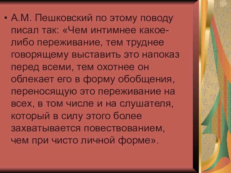 Слайд 12А.М. Пешковский по этому поводу писал так: «Чем интимнее какое-либо переживание,