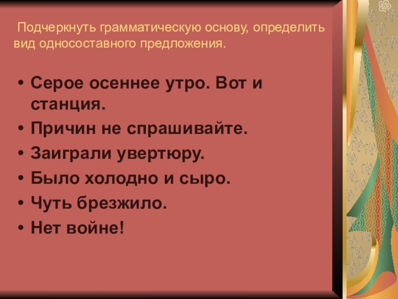 Слайд 3 Подчеркнуть грамматическую основу, определить вид односоставного предложения.