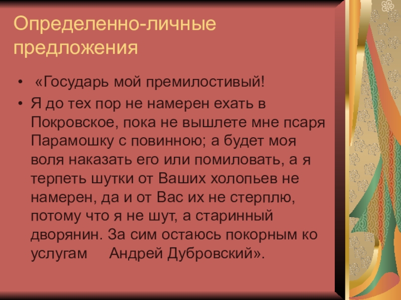 в Покровское, пока не вышлете мне псаря Парамошку с повинною; а будет моя воля наказать его или помиловать, а я терпеть шутки от Ваших холопьев не намерен, да и от Вас их не стерплю, потому что я не шут, а старинный дворянин. За сим остаюсь покорным ко услугам Андрей Дубровский».