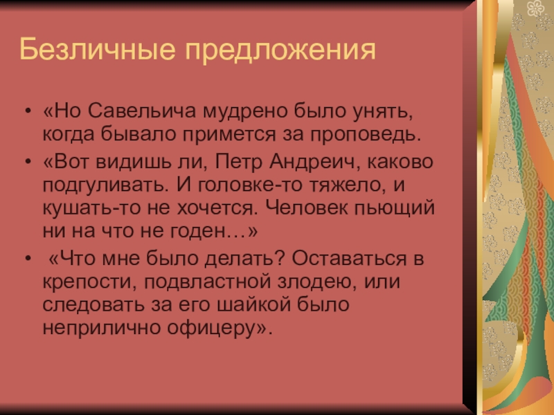 «Но Савельича мудрено было унять, когда бывало примется за проповедь.