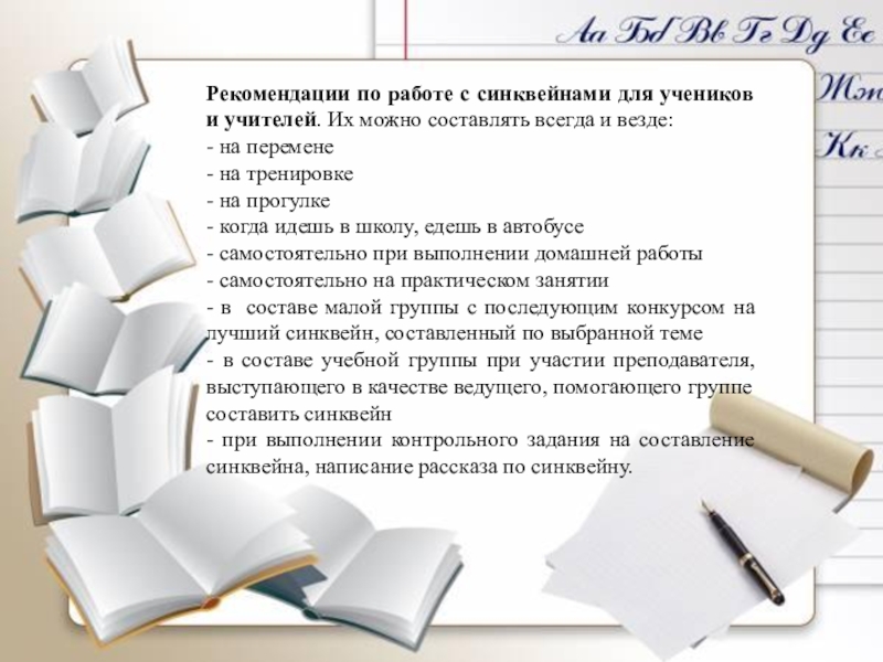 Слайд 9Рекомендации по работе с синквейнами для учеников и учителей. Их можно