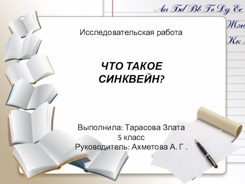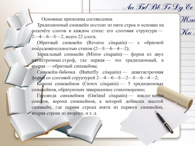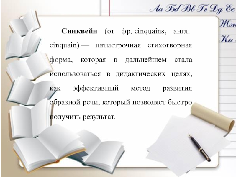 Слайд 3 Синквейн (от фр. cinquains, англ. cinquain) — пятистрочная стихотворная форма, которая в дальнейшем