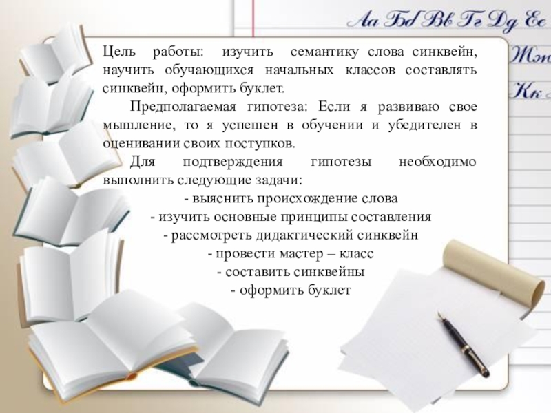 Слайд 2Цель работы: изучить семантику слова синквейн, научить обучающихся начальных классов составлять