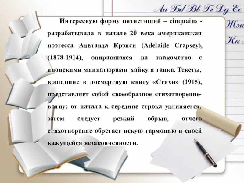 Слайд 4 Интересную форму пятистиший – cinquains - разрабатывала в начале 20 века