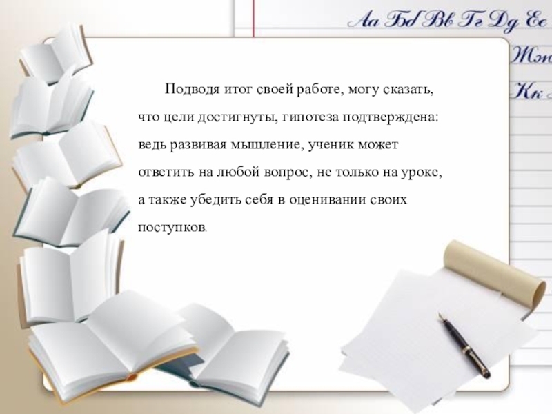 Слайд 8Подводя итог своей работе, могу сказать, что цели достигнуты, гипотеза подтверждена: