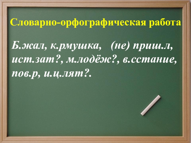 Словарно-орфографическая работаБ.жал, к.рмушка,  (не) приш.л, ист.зат?, м.лодёж?, в.сстание, пов.р, и.ц.лят?.