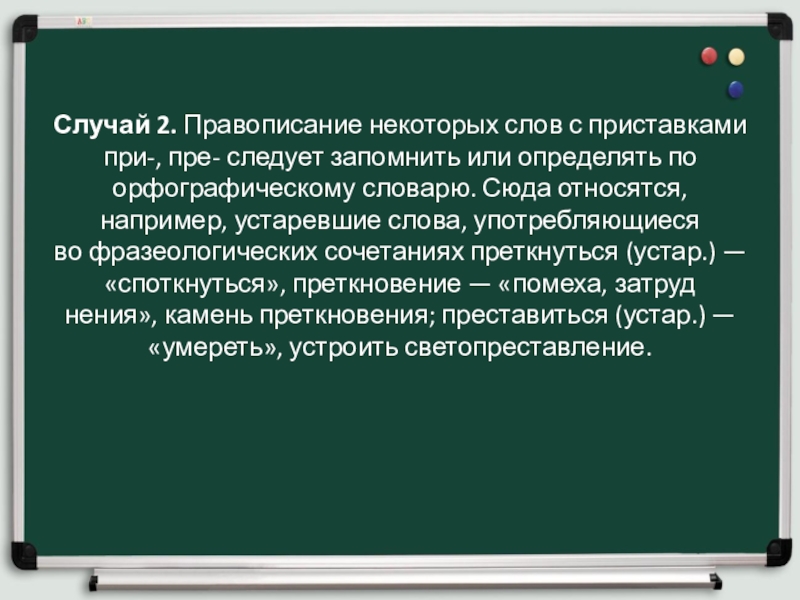 Слайд 21Случай 2. Правописание некоторых слов с приставками при-, пре- следует запомнить или определять по