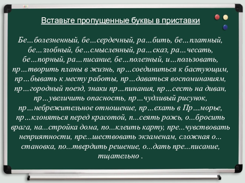 ра…чесать, бе…порный, ра…писание, бе…полезный, и…пользовать, пр…творить планы в жизнь, пр…соединиться к бастующим, пр…бывать к месту работы, np…дaваться воспоминаниям, пр…городный поезд, знаки пр…пинания, пр…сесть на диван, пр…увеличить опасность, пр…чудливый рисунок, пр…небрежительное отношение, пр…ехать в Пр…морье, пр…клоняться перед красотой, п...сеять рожь, о...бросить врага, на...стройка дома, по...клеить карту, пре...чувствовать неприятности, пре...шествовать экзаменам, сложная о...становка, по...твердить решение, о...дать пре...писание, тщательно .