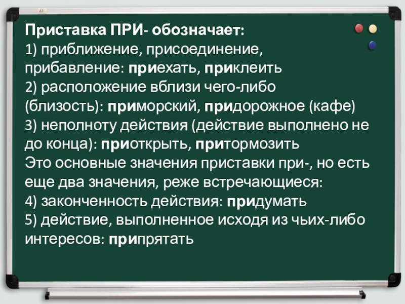 Это основные значения приставки при-, но есть еще два значения, реже встречающиеся:
