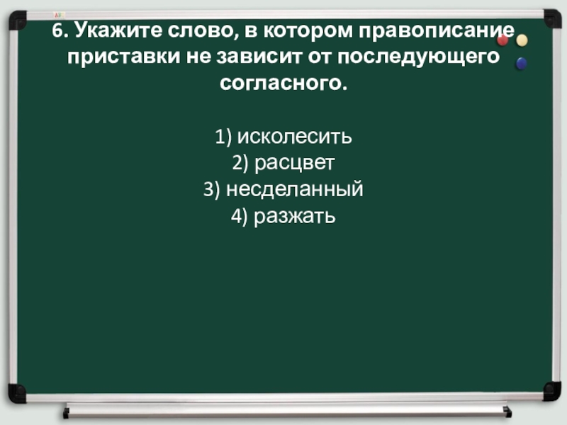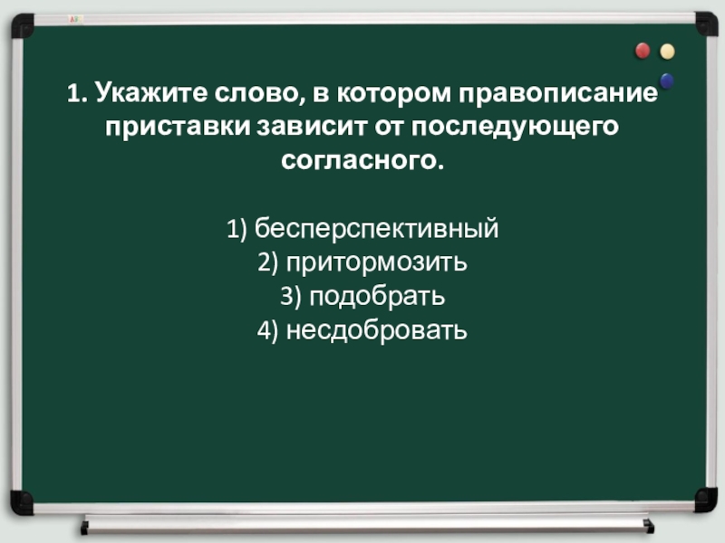 Слайд 251. Укажите слово, в котором правописание приставки зависит от последующего согласного.