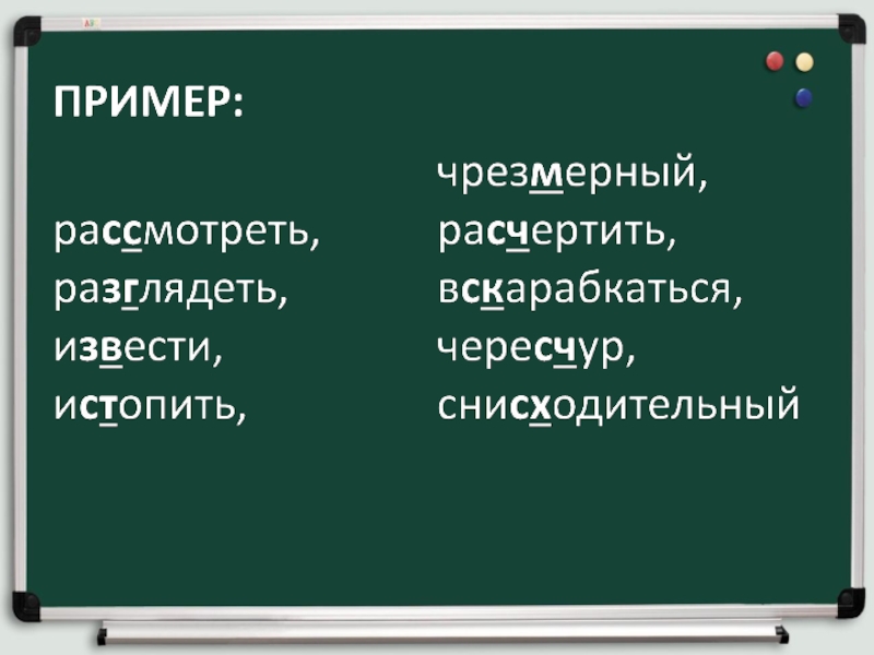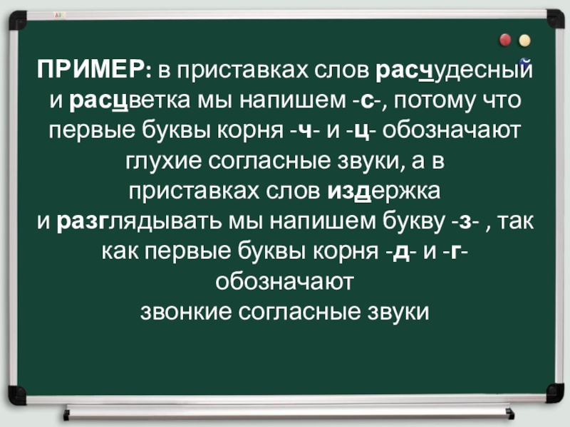 Слайд 9ПРИМЕР: в приставках слов расчудесный и расцветка мы напишем -с-, потому что первые буквы корня -ч- и -ц- обозначают