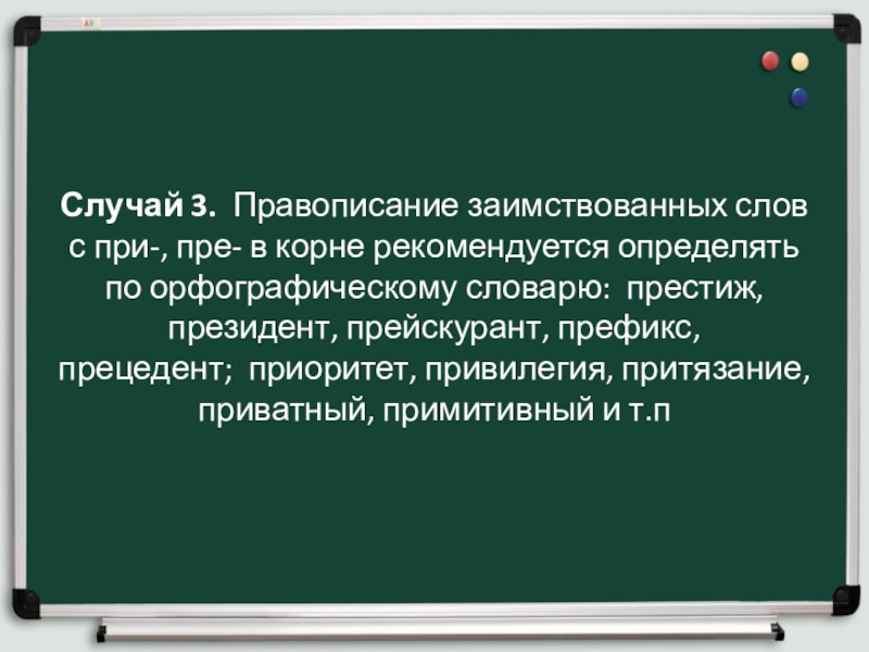 Слайд 22Случай 3. Правописание заимствованных слов с при-, пре- в корне рекомендуется определять по орфографическому словарю: престиж,