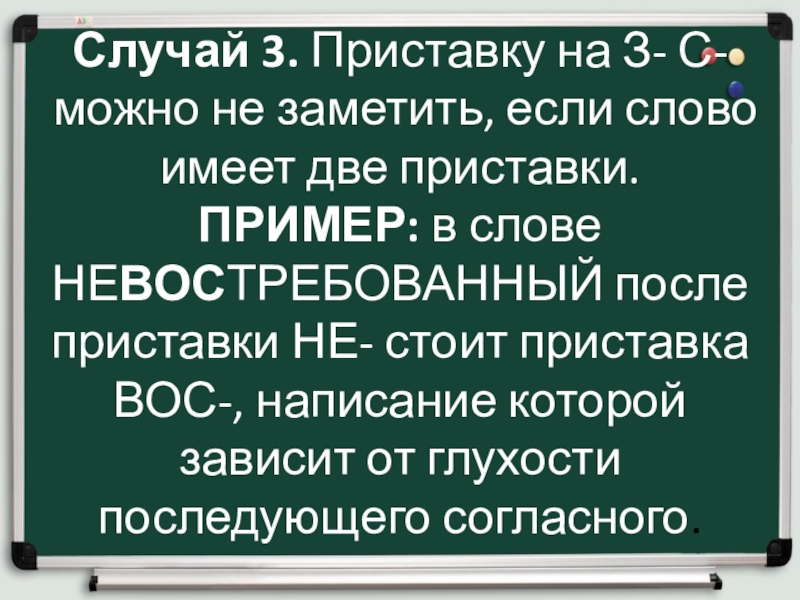ПРИМЕР: в слове НЕВОСТРЕБОВАННЫЙ после приставки НЕ- стоит приставка ВОС-, написание которой зависит от глухости последующего согласного.
