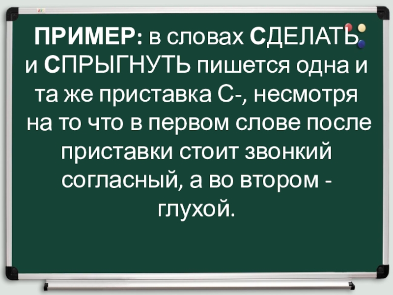 Слайд 11ПРИМЕР: в словах СДЕЛАТЬ и СПРЫГНУТЬ пишется одна и та же приставка С-, несмотря