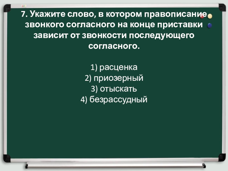 Слайд 317. Укажите слово, в котором правописание звонкого согласного на конце приставки зависит