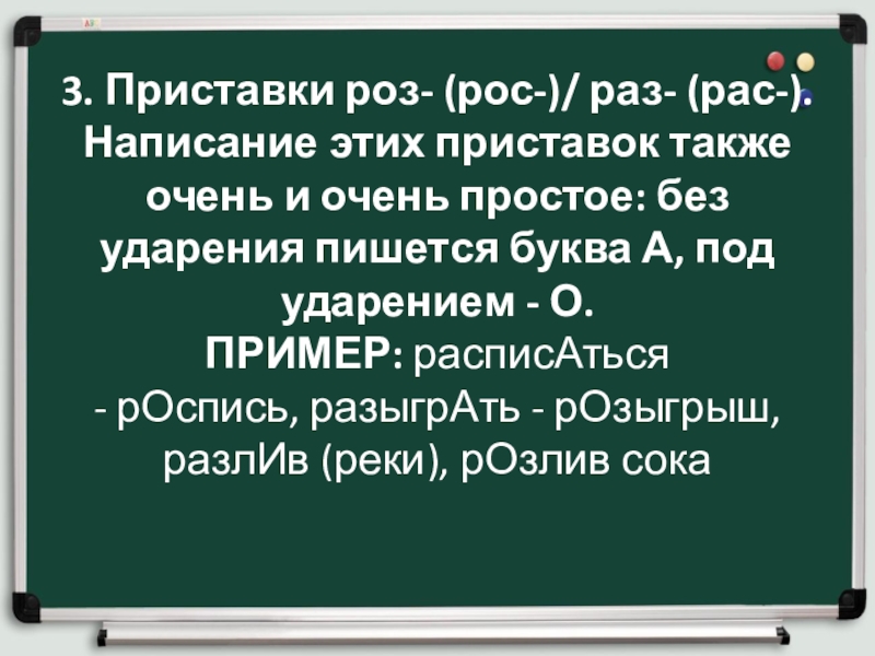 3) Приставки роз- (рос-)/ раз- (рас-), написание которых зависит от ударения;