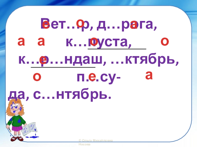 Вет…р, д…рога, к…пуста,к…р…ндаш, …ктябрь, п…су-да, с…нтябрь.еоаеоаааоое