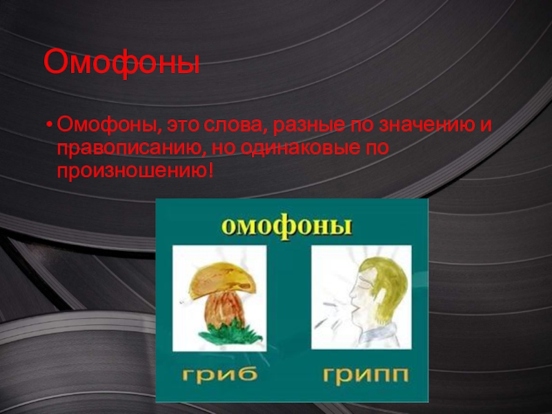 ОмофоныОмофоны, это слова, разные по значению и правописанию, но одинаковые по произношению!