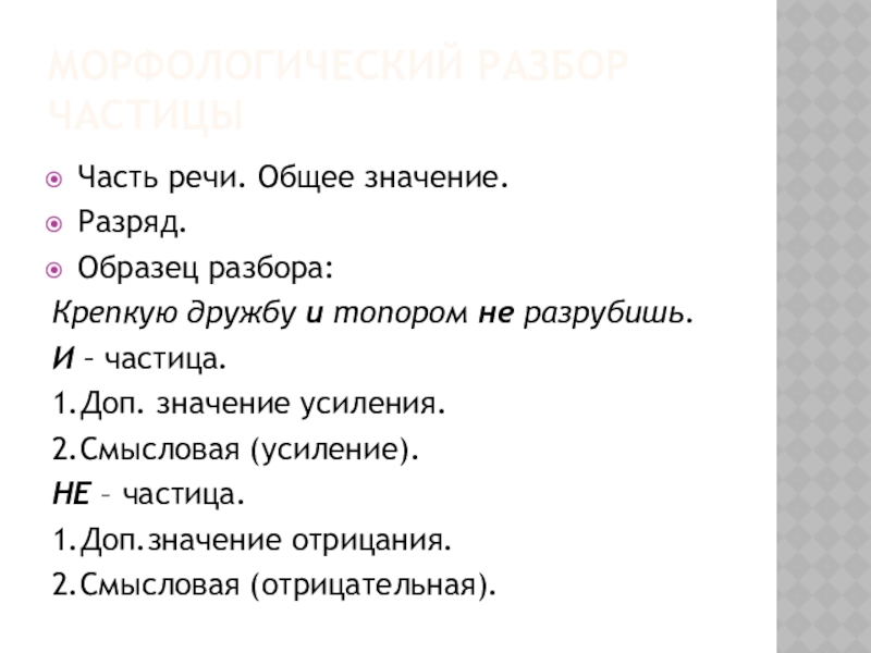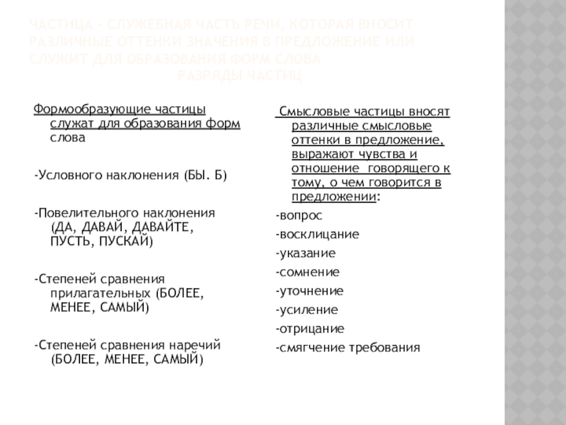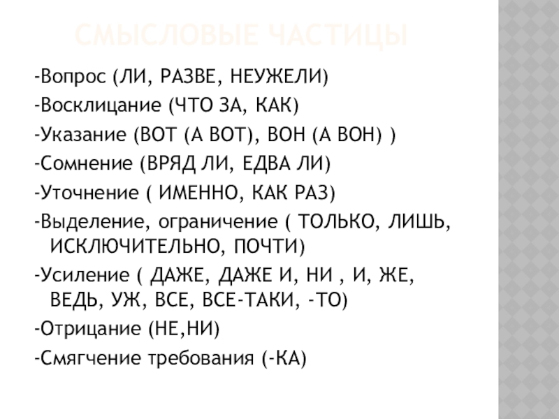 Смысловые частицы вносят различные смысловые оттенки в предложение, выражают чувства и отношение говорящего к тому, о чем говорится в предложении: