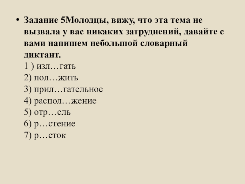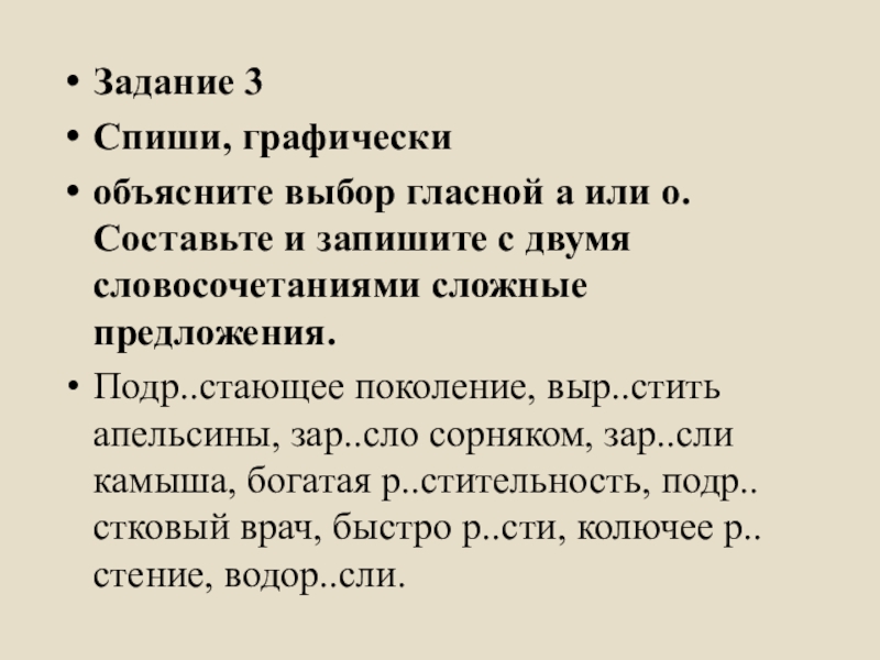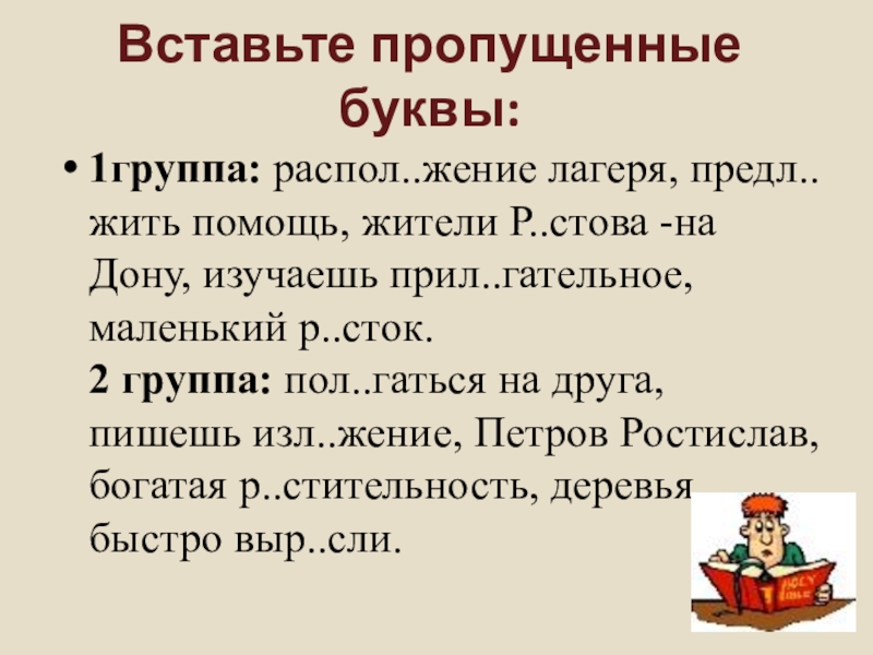 2 группа: пол..гаться на друга, пишешь изл..жение, Петров Ростислав, богатая р..стительность, деревья быстро выр..сли.
