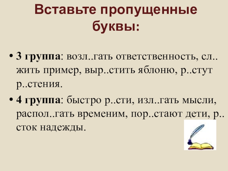 3 группа: возл..гать ответственность, сл..жить пример, выр..стить яблоню, р..стут