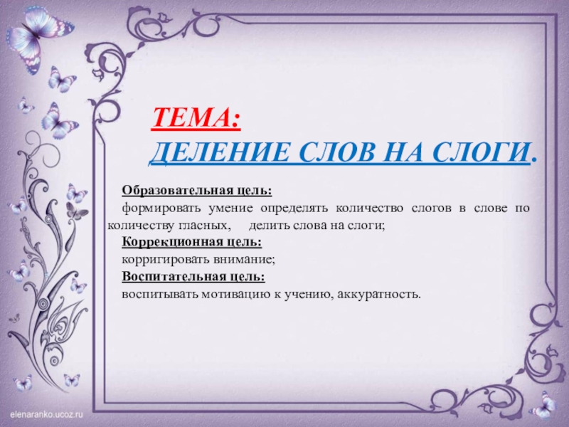 ТЕМА: ДЕЛЕНИЕ СЛОВ НА СЛОГИ.Образовательная цель: формировать умение определять количество слогов в слове по количеству гласных, делить слова на слоги;Коррекционная цель: корригировать внимание;Воспитательная цель: воспитывать мотивацию к учению, аккуратность.