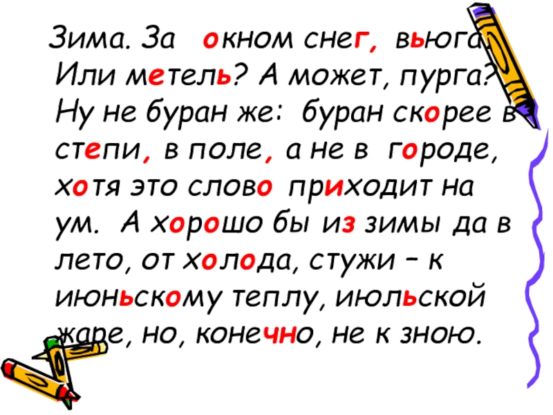 Зима. За (?)кном сне… в..юга. Или м…тел..? А может, пурга? Ну не буран же: буран ск…рее в ст..пи в поле а не в г..роде, х…тя это слов.. пр…ходит на ум. А х…р…шо бы и(з,с) зимы да в лето, от х…л…да, стужи – к июн(?)ск…му теплу, июл(?)ской жаре, но, конеч(?)но, не к зною.