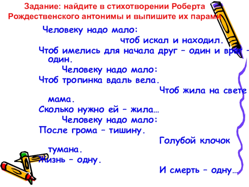 Задание: найдите в стихотворении Роберта Рождественского антонимы и выпишите их парами