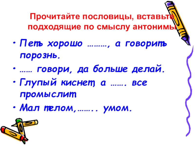 Прочитайте пословицы, вставьте подходящие по смыслу антонимы