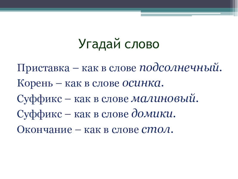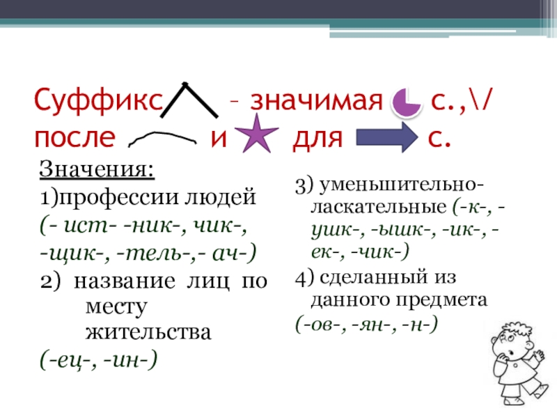 3) уменьшительно-ласкательные (-к-, -ушк-, -ышк-, -ик-, -ек-, -чик-)