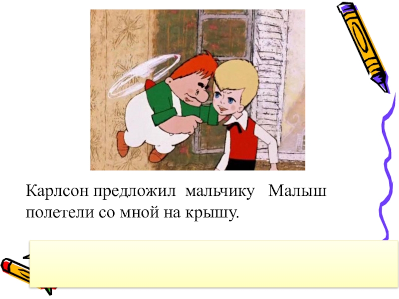 Слайд 83Карлсон предложил мальчику Малыш полетели со мной на крышу.