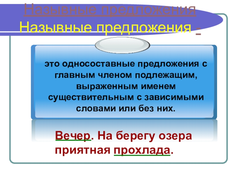 Назывные предложения Назывные предложения -Вечер. На берегу озера приятная прохлада.
