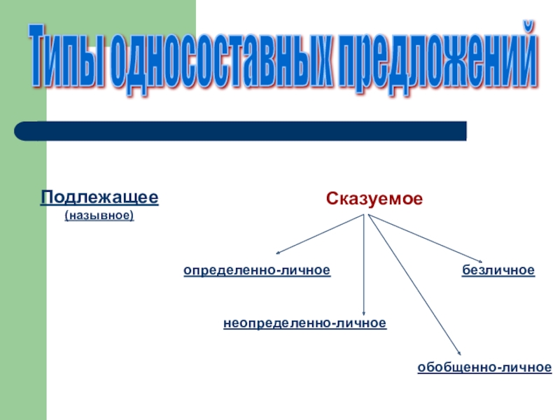 Типы односоставных предложенийПодлежащее(назывное)Сказуемоеопределенно-личное неопределенно-личное безличное обобщенно-личное