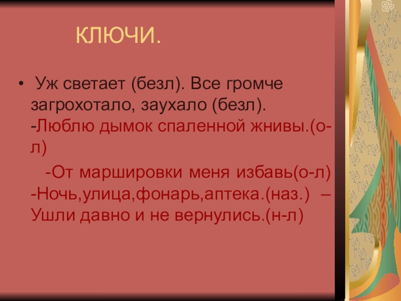 КЛЮЧИ. Уж светает (безл). Все громче загрохотало, заухало (безл). -Люблю дымок спаленной жнивы.(о-л)