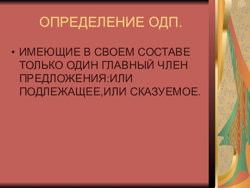 ОПРЕДЕЛЕНИЕ ОДП.ИМЕЮЩИЕ В СВОЕМ СОСТАВЕ ТОЛЬКО ОДИН ГЛАВНЫЙ ЧЛЕН ПРЕДЛОЖЕНИЯ:ИЛИ ПОДЛЕЖАЩЕЕ,ИЛИ СКАЗУЕМОЕ.