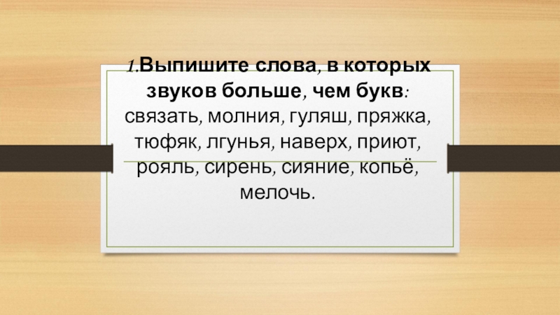 1.Выпишите слова, в которых звуков больше, чем букв: связать, молния, гуляш,
