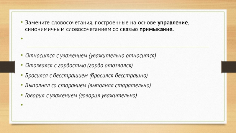 Слайд 10Замените словосочетания, построенные на основе управление, синонимичным словосочетанием со связью примыкание.