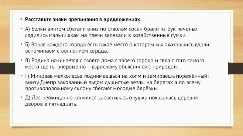 Д) Лес неожиданно кончился засветилась опушка показалась деревня дворов в пятнадцать.