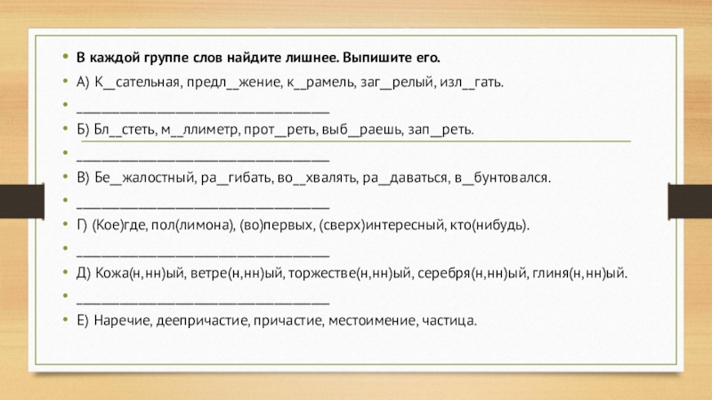 Слайд 6В каждой группе слов найдите лишнее. Выпишите его.