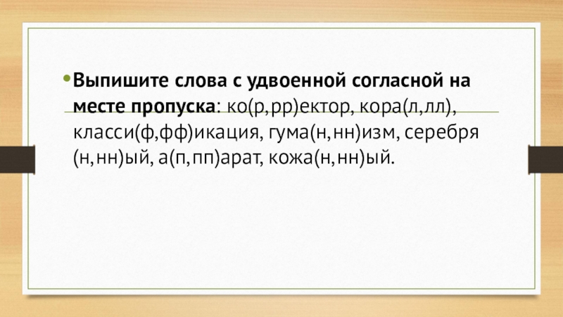 Слайд 5Выпишите слова с удвоенной согласной на месте пропуска: ко(р,рр)ектор, кора(л,лл), класси(ф,фф)икация,