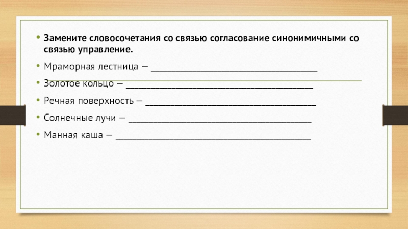 Слайд 7Замените словосочетания со связью согласование синонимичными со связью управление.
