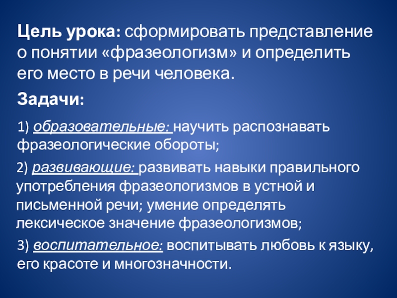 Цель урока: сформировать представление о понятии «фразеологизм» и определить его место в речи человека.
