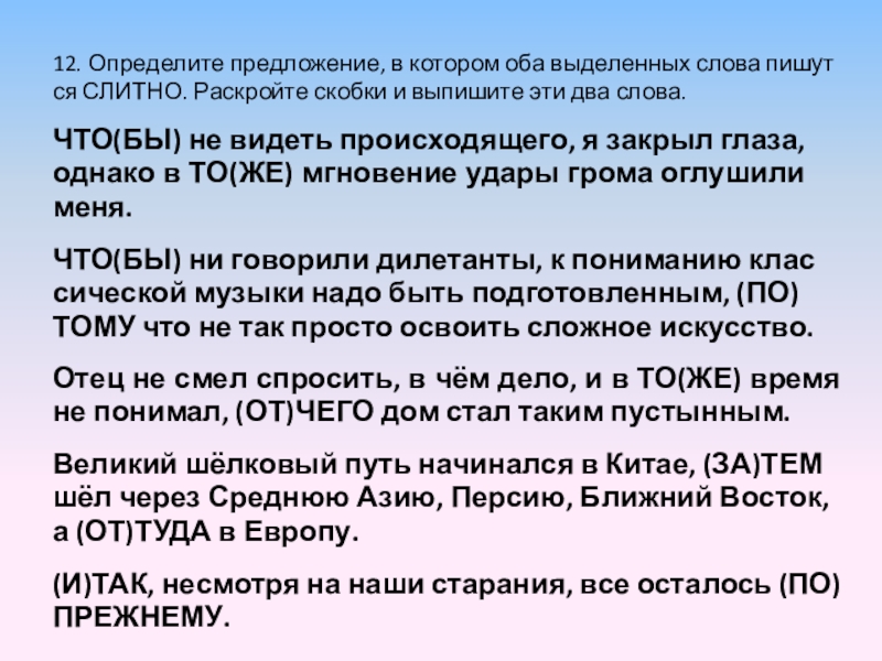 Слайд 1212. Определите предложение, в котором оба выделенных слова пишутся СЛИТНО. Раскройте