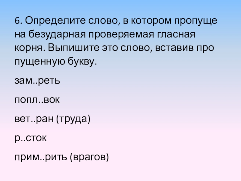 Слайд 66. Определите слово, в котором пропущена безударная проверяемая гласная корня. Выпишите