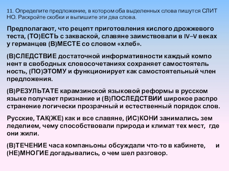 Слайд 1010. Определите предложение, в котором оба выделенных слова пишутся СЛИТНО. Раскройте